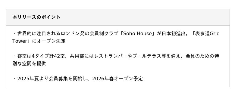 三井不動産株式会社(本社:東京都中央区、代表取締役社長:植田俊、以下「三井不動産」)とSoho House&Co inc.(本社:英国ロンドン市、CEO:Andrew Carnie)は、港区南青山において開発を推進中の「表参道Grid Tower(※1)」内に、日本初となる拠点「Soho House Tokyo」を開業することを決定いたしました。この新たな拠点は、2025年夏より会員募集を開始し、2026年春の開業を予定しております。