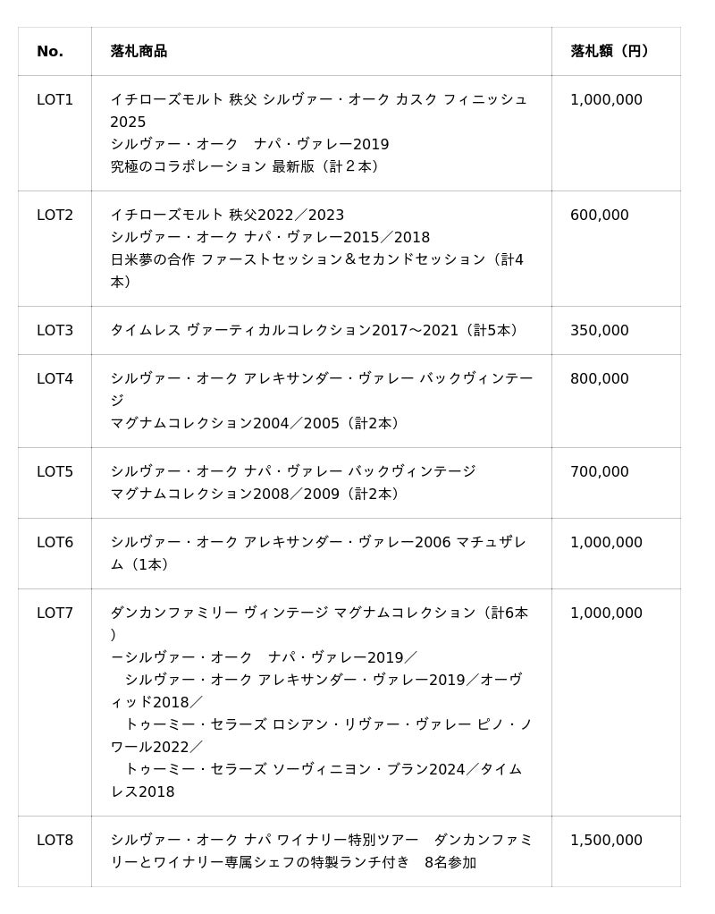 このチャリティオークションは、「シルヴァー・オーク」を所有するダンカンファミリーが「世界中の自然災害に多くの人々が心を傷めるなかで、カリフォルニアを代表するワイナリーとして、その社会的責務を果たしたい」と強く願い、その思いから実現したものです。米国内では多くのチャリティオークションに商品提供実績があるシルヴァー・オークですが、ワイナリー自ら主催する機会は希少で、かつ日本での開催は今回が初めてです。また、日本初開催につき、当オークションの趣旨に賛同いただいた、シルヴァー・オークと関係の深い株式会社ベンチャーウイスキーから、特別ロットとして埼玉県秩父市の蒸留所でシルヴァー・オークの樽を使って熟成した「イチローズモルト」が出品され、会場には代表の肥土伊知郎社長に参加いただきました。さらに、本イベント総合司会は菊間千乃氏、オークション進行は世界2大オークション会社の一つであるサザビーズ社が務め、いずれも同様に趣旨に賛同いただき、無償でご協力いただきました。