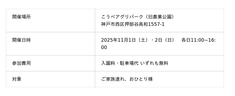 おひとり様、お子様連れ歓迎。当日は西神オリエンタルホテル前から無料シャトルバス運行予定。[荒天中止]