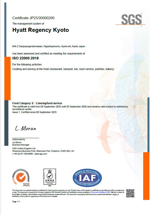 当ホテルは今回のISO 22000:2018の認証取得を機に、グローバル化が進む現代において、国内外のお客様へのおもてなしとして、食の安全に対する意識をさらに高め、京都という国際的な都市にふさわしい高品質なサービスを提供してまいる所存です。