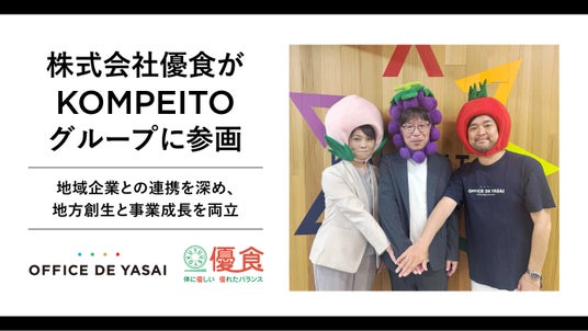 食の福利厚生サービス“設置型健康社食(R)“「OFFICE DE YASAI(オフィスで野菜)」を運営する株式会社KOMPEITO(東京都品川区、代表取締役CEO 渡邉瞬 以下、KOMPEITO)は、2025年10月1日付で、高齢者施設向け給食・在宅配食サービスを展開する株式会社優食(岡山県倉敷市、代表取締役社長 今城栄一郎、以下優食)の株式100%を取得いたしました。これにより、優食はKOMPEITOグループへ参画となりました。