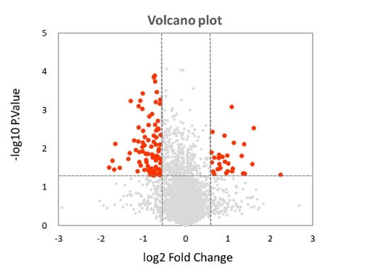 図1 pDC活性の高低と関連のあるタンパク質(赤いプロット)