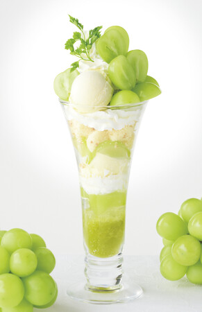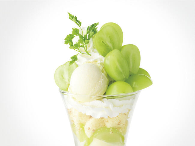 特長:旬の長野県産シャインマスカットを贅沢に使用した季節限定パフェ。種なしで皮ごと食べられ、パキッとした食感とともに豊かな甘みと高貴な香りが口いっぱいに広がるシャインマスカットに、自家製シャインマスカットグラニテ(※)やバニラアイスなどを組み合わせました。