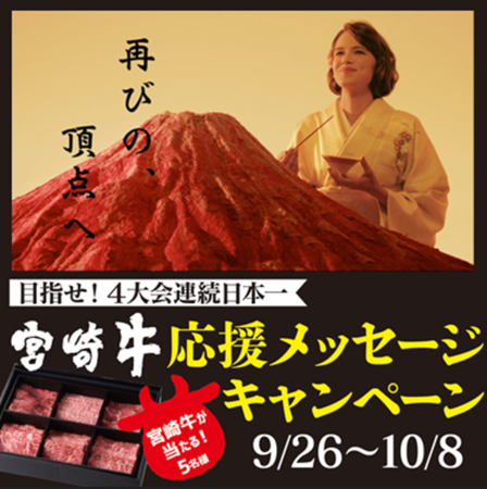 JA宮崎経済連の宮崎牛SNSアカウント(Twitter・Instagram・Facebook)にて、「目指せ!大会連続日本一宮崎牛応援メッセージキャンペーン」を9/26(月)~10/8(土)まで実施。