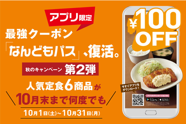 株式会社プレナスは、定食レストラン「やよい軒」を、2022年8月末現在366店舗展開しております。「やよい軒」では、多くの方に「やよい軒」の定食を楽しんでいただきたいという思いから、公式アプリ限定で人気の定食が何度でも100円引きの特別価格でお召し上がりいただけるクーポン『なんどもパス』を、9月に引き続き、10月も配信いたします。 第2弾は、10月1日(土)より31日(月)までの期間中、『サバの塩焼定食』や『味噌かつ煮定食』、『和風おろしハンバーグ定食』などの6定食を、お得な特別価格でお楽しみいただけます。