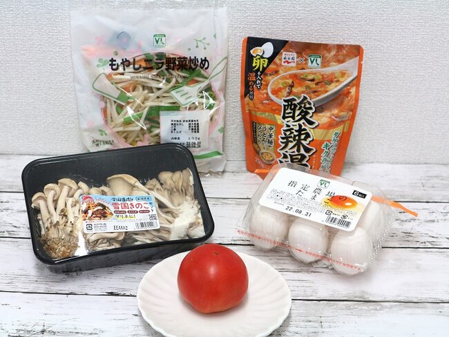 VLもやしニラ野菜炒め、VL酸辣湯、雪国きのこセット、VL指定農場のたまご、トマト ※地域によりパッケージが異なります