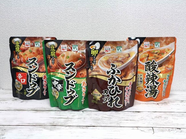 VLスンドゥブの素(辛口・中辛)、VLふかひれスープ、VL酸辣湯(各・本体価格100円/税込108円)