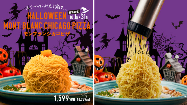 お客様の目の前で超極細のモンブランクリームをしぼり出す、新感覚のハロウィン限定モンブランシカゴピザはいかがでしょうか?