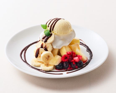 相性の良いチョコレートソースで、最後まで飽きのこない味わいに仕上げました。たっぷりのフルーツと一緒に味わえるシフォンです。