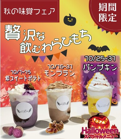 テレビで話題のとろり天使のわらびもちが提供する飲むわらびもちドリンクに札幌白石店限定で秋の味覚フェアとして、飲むわらびもち紫スイートポテト、飲むわらびもちモンブラン、飲むわらびもちパンプキンが登場する。ハロウィン企画の飲むわらびもちパンプキンは北海道産のかぼちゃを使用した地産地消のドリンクとなっている