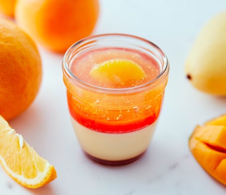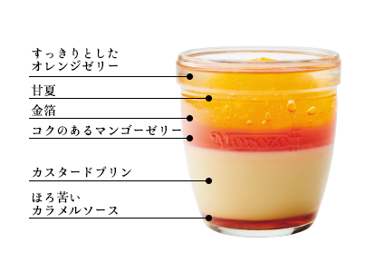 コクのある甘みを楽しめるマンゴーゼリーとすっきりとしたオレンジゼリー、夕日をイメージした甘夏、モロゾフ定番のカスタードプリンにほろ苦いカラメルソースを合わせました。