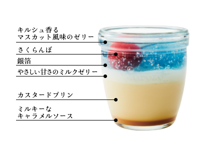 キルシュ香るマスカット風味のゼリーや、やさしい甘さのミルクゼリー、太陽をイメージしたさくらんぼ、モロゾフ定番のカスタードプリンにミルキーなキャラメルソースを合わせました。