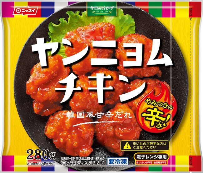 対象商品は、今春の発売以来、ご好評をいただいている「今日のおかず ヤンニョムチキン」(韓国風鶏から揚げ)をはじめ、おなじみの「同 若鶏の竜田揚げ」、「同 若鶏の旨だれから揚げ」。ニッスイは、ご家庭の食卓で手軽においしく召しあがれる冷凍から揚げラインアップで、充実した毎日の食卓づくりを応援します。