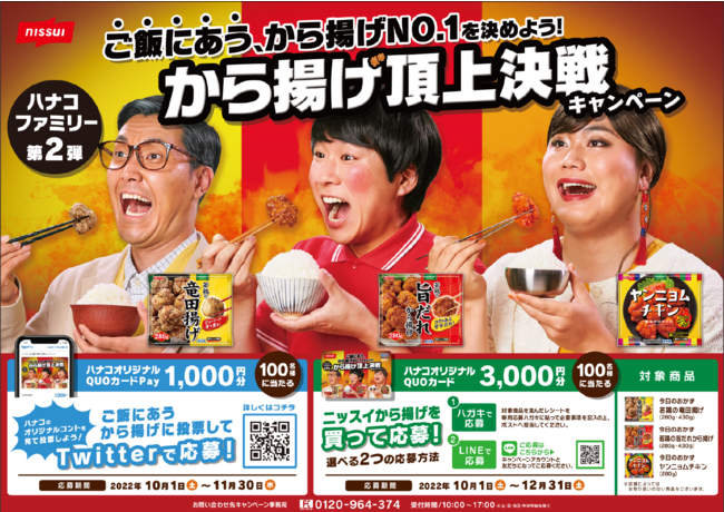 この動画を見て、ご飯にあうから揚げ3品のなかから1品を選んで投票した方に、抽選でオリジナルQUOカードPay1,000円分を100名様にプレゼントする「ご飯にあうから揚げに投票してTwitterで応募!」キャンペーンと、対象商品を購入した方に抽選でオリジナルQUOカード3,000円分を100名様にプレゼントする「ニッスイのから揚げを買って応募!」キャンペーンを同時に実施します。