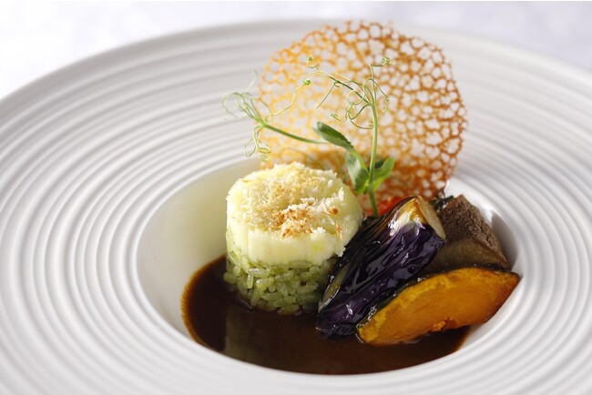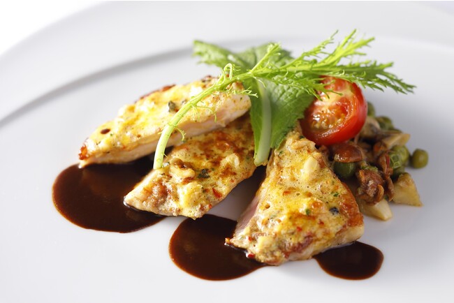 *「サーモンのムースを詰めた鮎のヴァプール えごまのソース」(写真)は、鮎の中にサーモンのムースを詰め、蒸して表面を炙りました。岐阜県産の”えごま”を使用したソースとご一緒にお召し上がりください。