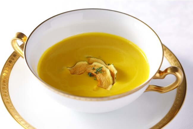 *「宿儺かぼちゃのポタージュ」(写真)は、とてもクリーミーな食感の温かなかぼちゃスープです。
