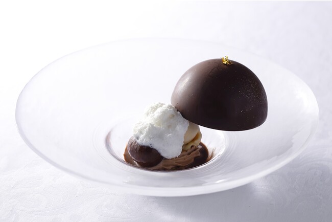 *「岐阜県産とフランス産の栗とチョコレートのコンビネーション」(写真)は、チョコレートソースや栗のアイスクリーム、ヌガティーヌやホワイトチョコレートとミルクの泡、岐阜県産の栗などがドーム状のチョコレートの中に隠れており様々な食感をお楽しみいただけるデザートです。