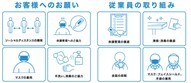 政府及び関係各所からの発表や指導に基づき、ご利用いただく皆 様に安心して快適にお過ごしいただけますよう、衛生管理の強化や感染防止対策に取り組んでおります。従業員の対策はもちろん、ご来場のお客様にも感染防止対策のご協力をお願いいたします。