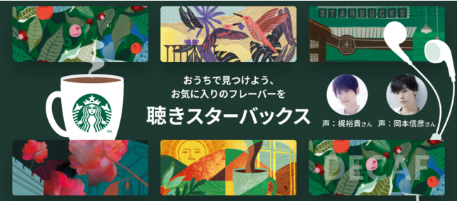 ネスレは、おうちで手軽にスターバックスのお店にいるようなひとときを味わえる製品として、スターバックス家庭用コーヒーを展開しています。厳選されたアラビカ種100%の豆を使ったスターバックス コーヒーには、ローストと味わいの違いで全6種類のフレーバーがあります。このたび、個性豊かなラインアップの中から皆様にお気に入りのフレーバーを見つけていただくために、特別な音声コンテンツ「聴きスターバックス」をご用意しました。人気声優の梶裕貴さんと岡本信彦さんが、それぞれのフレーバーにあわせた6つのフレーバーストーリーをお届けします。