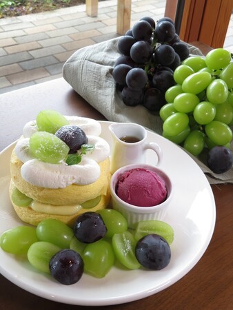 人気商品である県内産の新鮮なたまごをふんだんに使用したふわふわのスフレパンケーキに、喜多方産のシャインマスカットとブドウを贅沢にトッピング。パンケーキの間にはカスタードクリームとシャインマスカットを挟み、濃厚なぶどうのシャーベットを添えました。11月までの期間限定です。