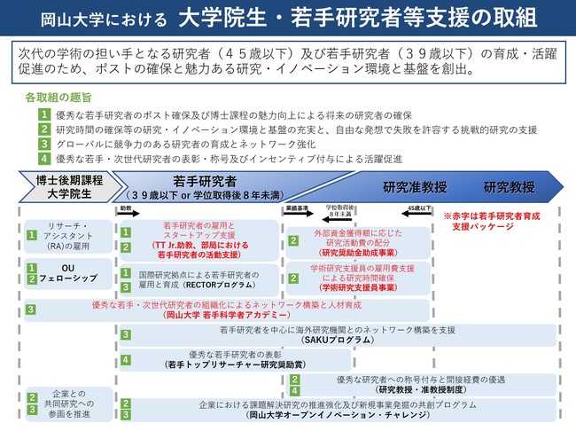 岡山大学は、2021年2月に文部科学省「科学技術イノベーション創出に向けた大学フェローシップ創設事業」の採択を受け、同制度を創設。その後、2021年9月にJST「次世代研究者挑戦的研究プログラム」にも採択されました。