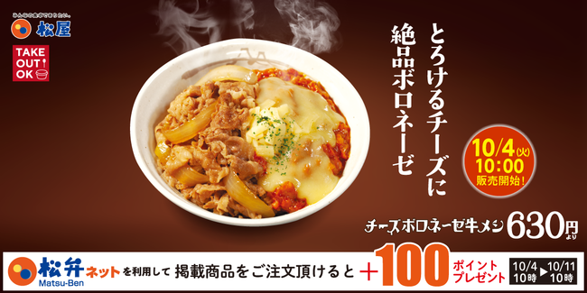 10月4日10時~10月11日10時まで、松弁ネットを利用して「チーズボロネーゼコンボ牛めし」をご注文頂けると、100ポイントプレゼントいたします。