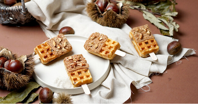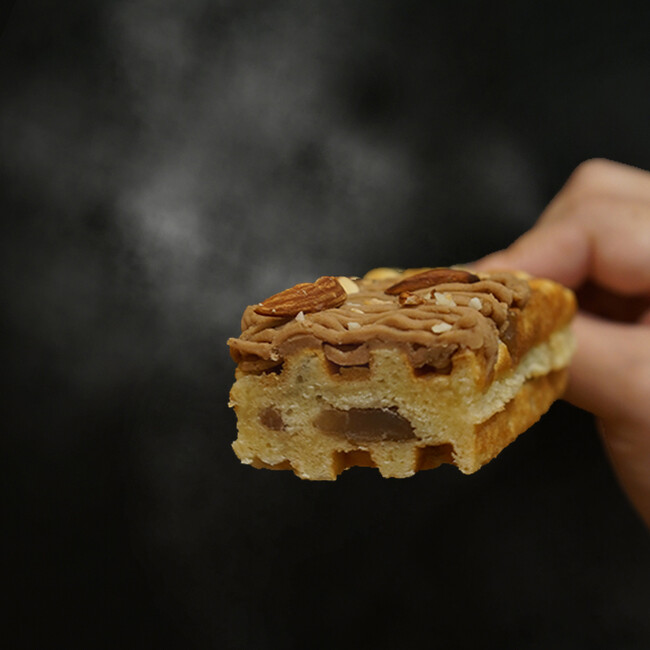 大粒ザラメが入った京ワッフルの生地には、甘く煮込んだ栗をたっぷりと練り込みました。焼き上がった生地には栗のペーストをふんだんに絞り、香ばしいアーモンドをトッピング。
