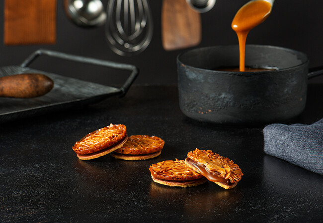 薄く焼き上げたバターサブレにはチョコレートをまとわせ、香ばしく華やかな甘さのアーモンドフロランタンとバターサブレで、とろけるキャラメルをサンドしました。芳醇なバターと香ばしいアーモンドそして、とろけるキャラメルと素材そのものの風味を感じていただける当店を代表するフレーバーです。