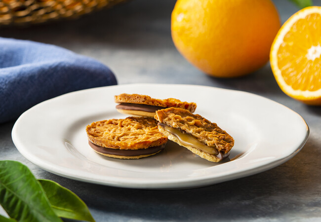 甘味と酸味のバランスが絶妙なオレンジの香り豊かなとろけるキャラメルを、クーベルチュールチョコレートで包み、香ばしく華やかな甘さのアーモンドフロランタンとバターサブレでサンドしました。清々しいオレンジのデザインをあしらった限定のパッケージでお届けします。