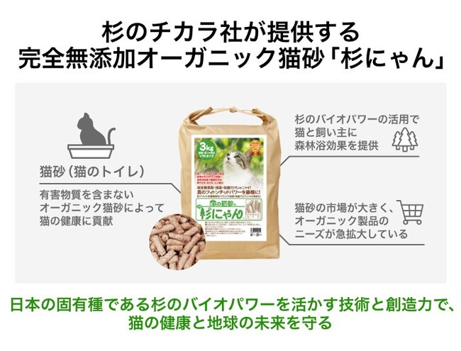 杉のチカラ株式会社では、日本固有種の杉の成分を利用する独創テクノロジーで、ペットにも人にも地球にも優しいオーガニック商品やサービスを提供することを通じて「ペットと人のヘルスケアライフ」をサポートし、持続可能で豊かな社会の実現に尽力してまいります。