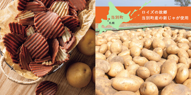 ロイズふと美工場のある北海道・当別町で今年収穫された"新じゃが"のみを使用したポテトチップの片面に、口どけの良いまろやかなチョコレートをコーティング。ミルクの風味が感じられるまろやかでやさしい口あたりのチョコレートをコーティングすることで、新じゃがの味わいをより楽しめるおいしさに仕上げました。