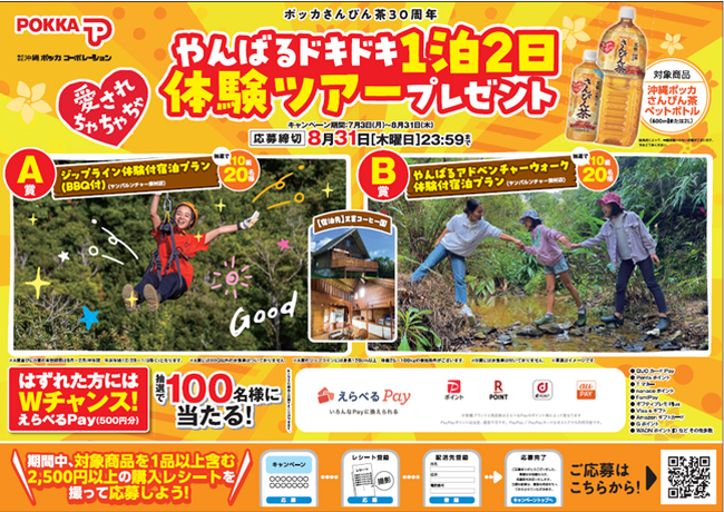 最後に、より沖縄のよさや魅力の発見につながるよう、「やんばるドキドキ1泊2日体験ツアープレゼントキャンペーン」を実施します。やんばるの豊かな自然を満喫していただき、「元祖 沖縄ポッカさんぴん茶」とともに、思い出に残るツアーを企画しました。ぜひ、この機会にご応募下さい。