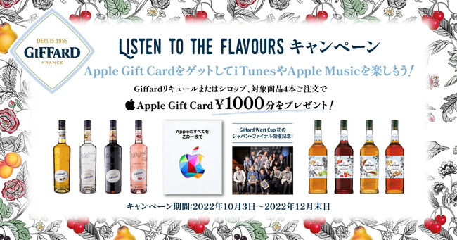 対象商品4本(リキュールは4本セット/シロップは対象商品6本のうちいずれか4本)をお買い上げいただくと、Apple Music・iTunes Storeなどの音楽コンテンツに使用することができるApple Gift Card 1000円分をもれなくプレゼント。音楽とカクテル・メイキングのペアリングを体感してもらうことで、ジファールのフィロソフィーである「Spirit of Art」をより多くの飲食店様に広めることを目指します。