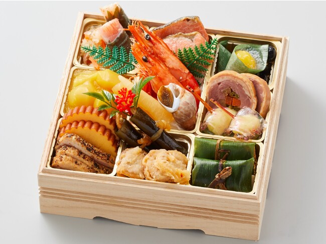 【一の重】伊達巻き/合鴨ロースパストラミ/金団・栗甘露/紅白なます/かにかま奉書/帆立梅肉南蛮/子持ちわかさぎ昆布巻き/ばい貝/味付け数の子/焼き海老/銀鮭味噌焼き/鰊と湯葉の笹包み/合鴨野菜三色巻き/柚子百合根餡包み/黒豆(金粉)/笹巻マンゴー