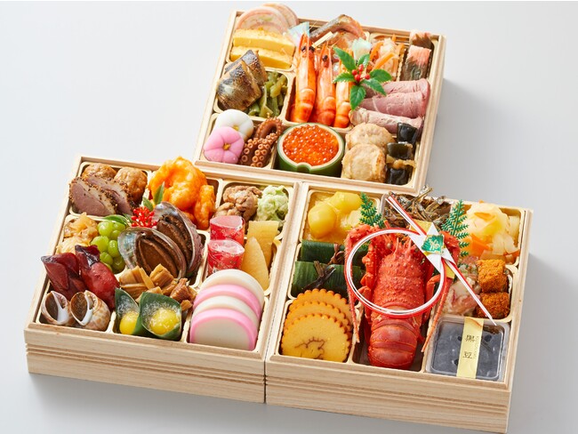 大きな伊勢海老が目を引く、豪華な和のおせち三段重です。こだわりの食材を、一品一品、料理人が丁寧に仕上げました。