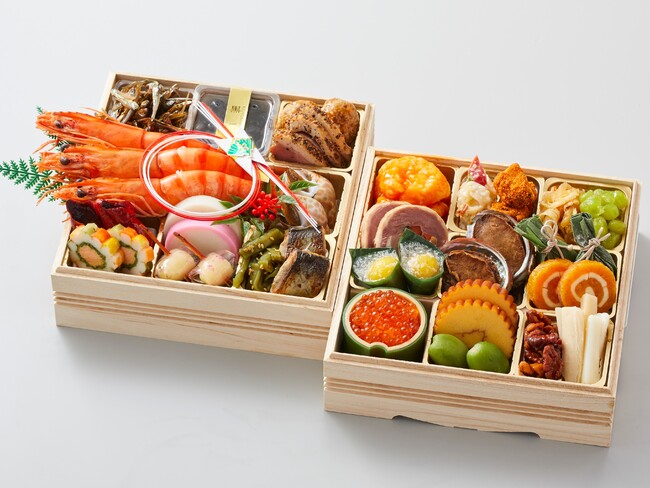 海老の塩茹でやいくらと北欧サラダ、合鴨ロースパストラミなど、贅沢な人気メニューをつめた二段重のおせちです。
