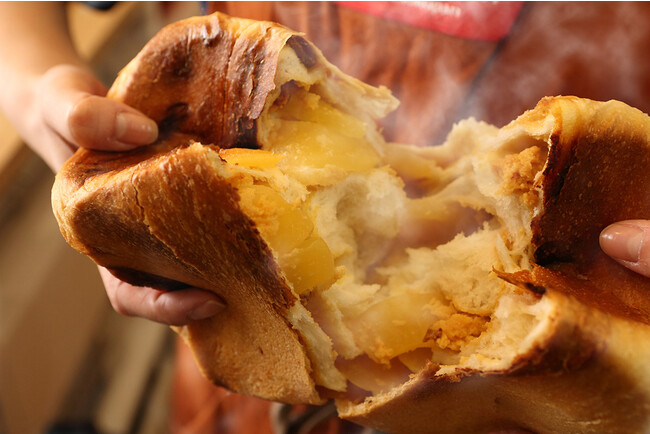 北海道産のカボチャを練り込んだ黄色の生地に、カラメル風味のカボチャあんと、カリッと香ばしいパンプキンシードがたっぷり折り込まれた「まるごとパンプキン食パン」は、