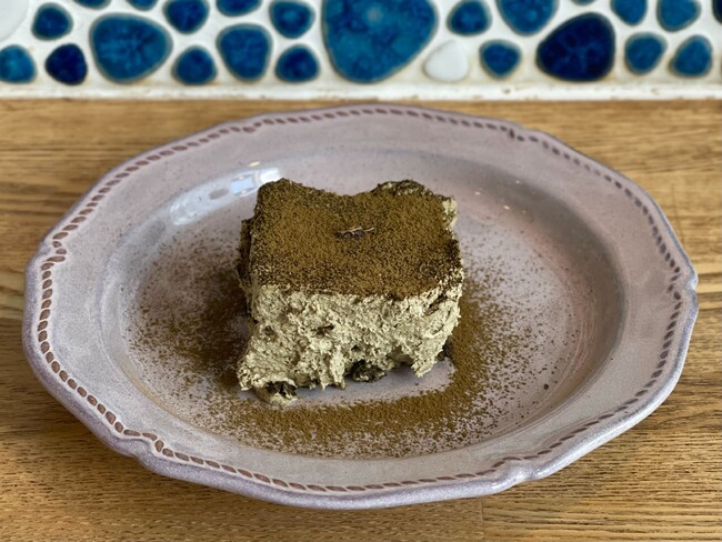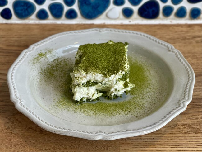 ほうじ茶と抹茶を使用したティラミスに茶葉をたっぷり入れた濃厚な生クリームを絞りました。