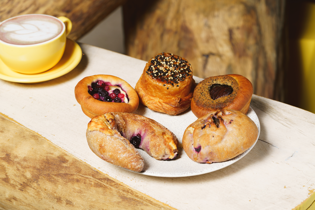 ふわふわの菓子パン生地にサワーカスタードを敷き詰めカシス、グロゼイユ、ワイルドブルーベリーをトッピングし焼き上げました。