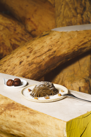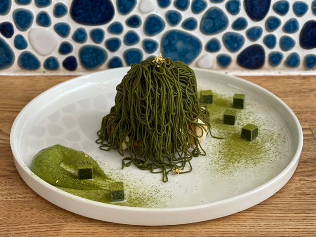 静岡県産の抹茶と栗を合わせたモンブランペーストを1ミリの細さで絞りました。中には抹茶アイス、抹茶マスカルポーネクリームを、入れた抹茶と今が季節の栗を合わせたムッフルプレート