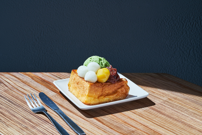 大人気のフレンチトーストに抹茶アイスと白玉、あずき、栗をトッピングしました。