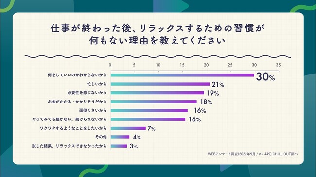 仕事終わりのリラックス習慣がない約44% にその理由を尋ねると、うち約30%が「何をしていいかわからないから」、約20%が「忙しいから」と回答しました。