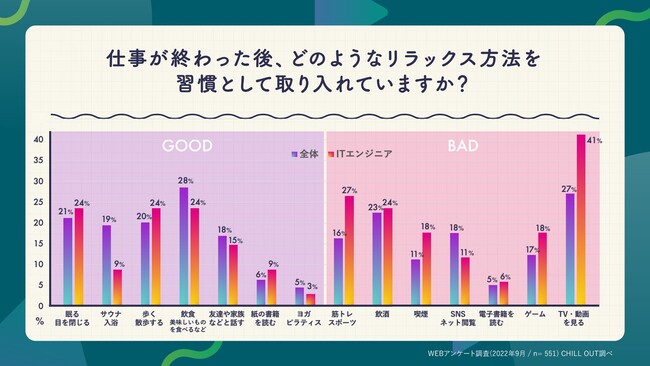 さらに職業別で「仕事終わりのリラックス習慣」を見ると、脳科学的にあまり良くない習慣を取り入れているのは「ITエンジニア」でした。特に「TV・動画を見る」ITエンジニアは全体平均約27%の約1.5倍にあたる約41%が取り入れていると回答しました。このほか、筋トレ・スポーツなどの激しい運動についても、全体平均約16%に比べて約10ポイント以上高い約27%が取り入れていると回答したほか、ゲームを取り入れている人も全体よりも約5ポイント以上高い約18%が取り入れていました。