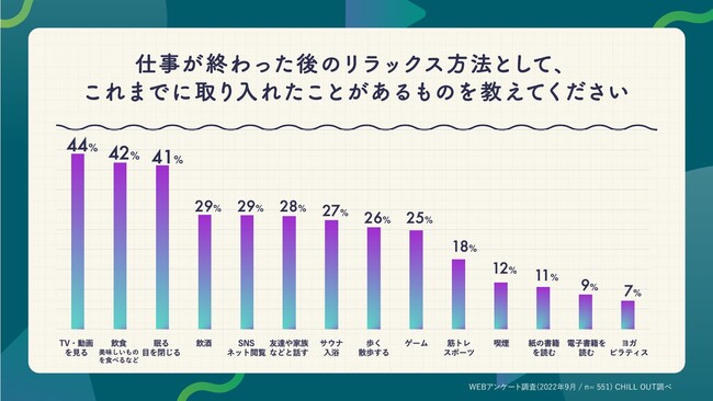 約44%の人が「仕事終わりのリラックス習慣は特にない」と回答しており、うち4人に1人が「何をしていいかわからない」と回答した。