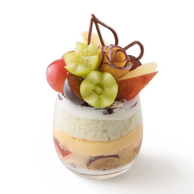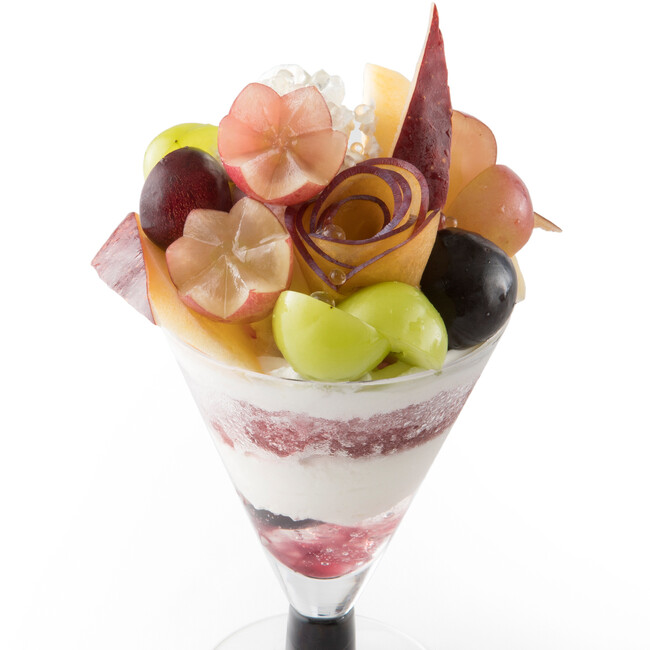 グラスにはぶどうソース、コアントローゼリー、フロマージュムース、ぶどうグラニテ、ホイップクリームを重ね、バニラアイスとぶどうシャーベットとトップに小布施フルーツを飾りました。小布施町産のりんごの甘さやぶどうの食感をお楽しみください。