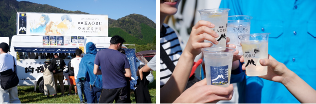 本イベントでは、熊本県人吉市出身で東京のバーで活躍している深水稔大さん監修の、ちょっと贅沢な「白岳しろ」「白岳KAORU」のオリジナルドリンクを提供。スッキリとした飲み口と米のふくよかな旨味が特長の「白岳しろ」の「しろハイボール」、レモンの酸味が「白岳KAORU」の吟醸香を引き立てる「KAORUレモンサワー【辛口】/【甘口】」、白岳KAORU独特の果実のような吟醸香とソーダの相性が抜群な「KAORUハイボール」など、屋外の開放的な空間の中で、来場者によく冷えた香り高い白岳シリーズを楽しんでいただきました。