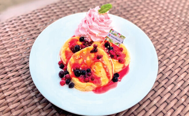 リコッタチーズを使ったふわふわパンケーキにコキア色のベリーソースをかけ、特製のストロベリーホイップクリームを添えた、甘みと酸味がマッチしたスイーツです。