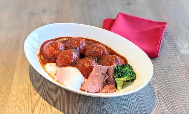 小玉ライスにスパイスの効いた辛口カレーをかけて、可愛らしいコキアに見立てました。自家製のローストビーフと辛さを中和する温泉卵と一緒にお召し上がりください。