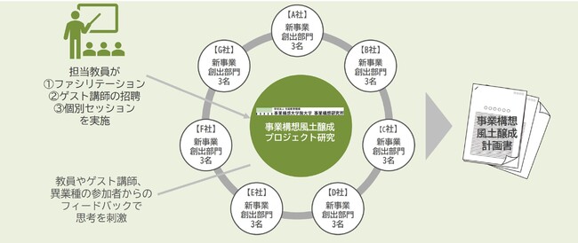 社内新事業創出に取り組む各社・各部門より寄せられた課題に対して、事業構想大学院大学が培ったイノベーション風土醸成の知見を活かした新事業創出のための研究会を組成。専門的かつ短期間のカリキュラムで、実践を見据えた事業構想研究を支援します。