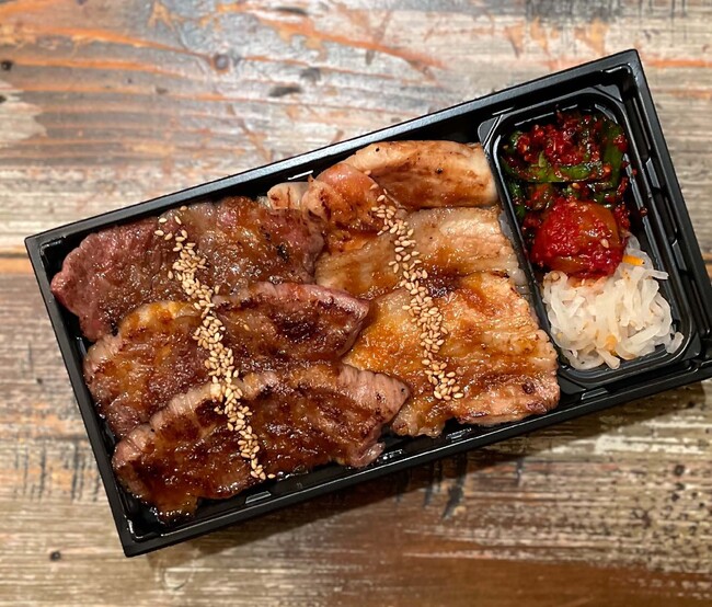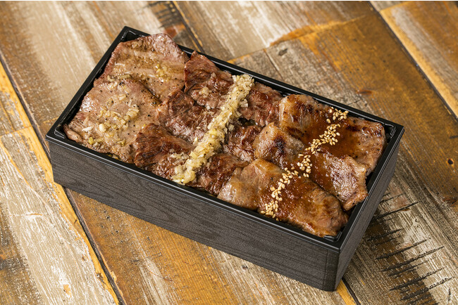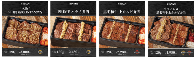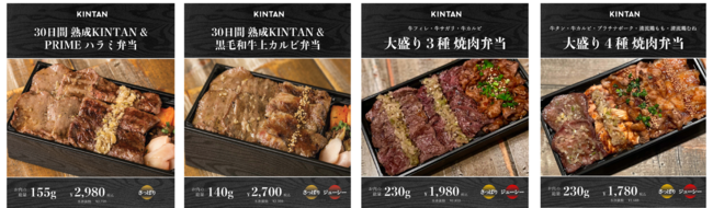 KINTANで人気の熟成KINTAN、黒毛和牛上カルビ、KINTAN塩ハラミの3種がたっぷり175g、ごはん250gの総量400g超のボリューム満点なお弁当です。